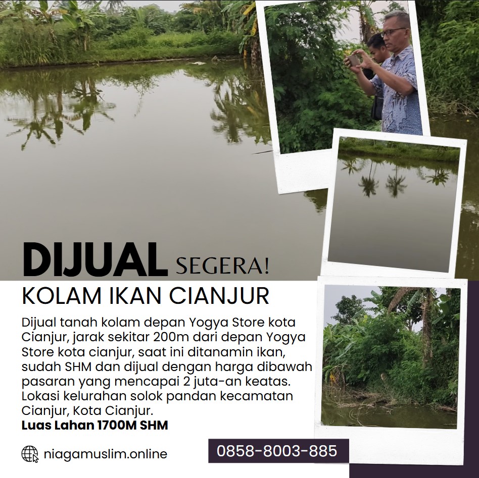 Dijual tanah kolam depan Yogya Store kota Cianjur, jarak sekitar 200m dari depan Yogya Store kota cianjur, saat ini ditanamin ikan, sudah SHM dan dijual dengan harga dibawah pasaran yang mencapai 2 juta-an keatas.